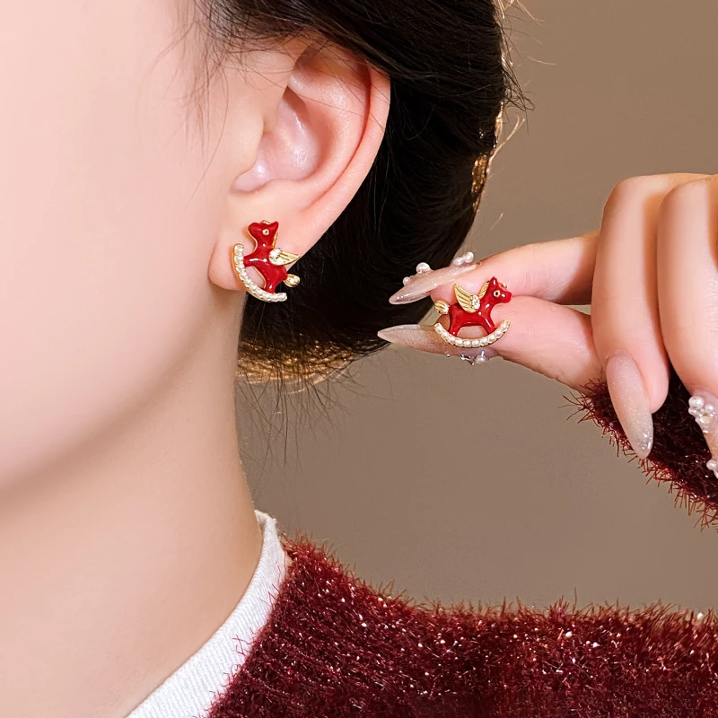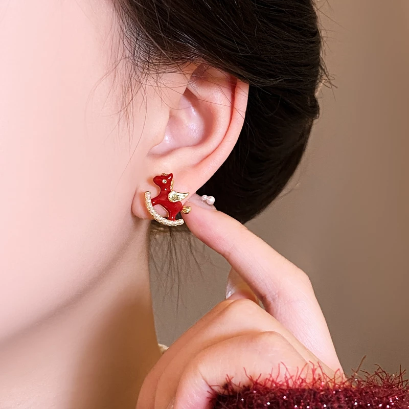 These whimsical stud earrings feature a winged rocking horse design, crafted from gold-tone alloy with vibrant red decorative enamel. The horse’s wings are accented with tiny cubic zirconia stones, while the base of the rocker is lined with round faux pearls—blending playful charm with delicate sparkle.