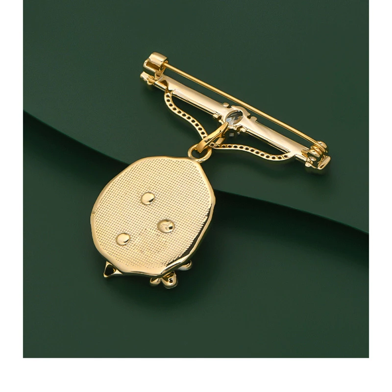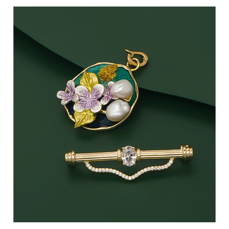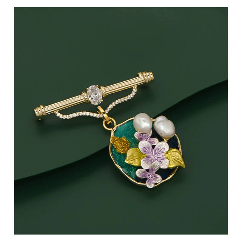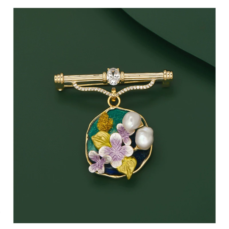 This elegant bar-style brooch blends classic design with lush floral details. Crafted from durable alloy with a gold-tone finish, it features a central decorative clear stone (cubic zirconia-like) accented by small matching stones, plus a pendant with simulated pearls, vibrant enamel flowers (in purple and green hues), and textured metallic accents. The vintage-inspired frame adds a refined touch, making it a versatile accessory for formal attire, daily outfits, or as a thoughtful gift.