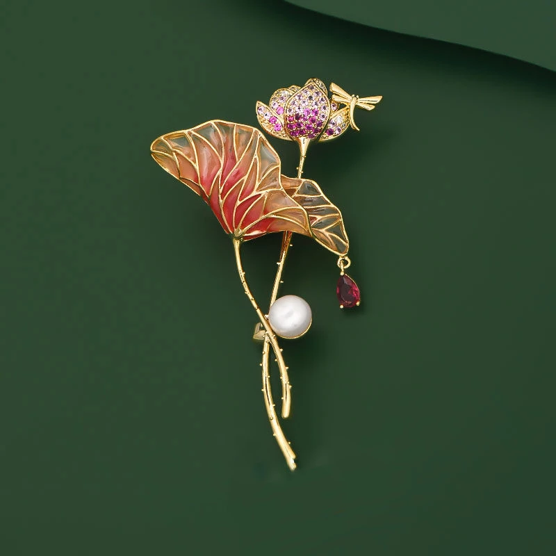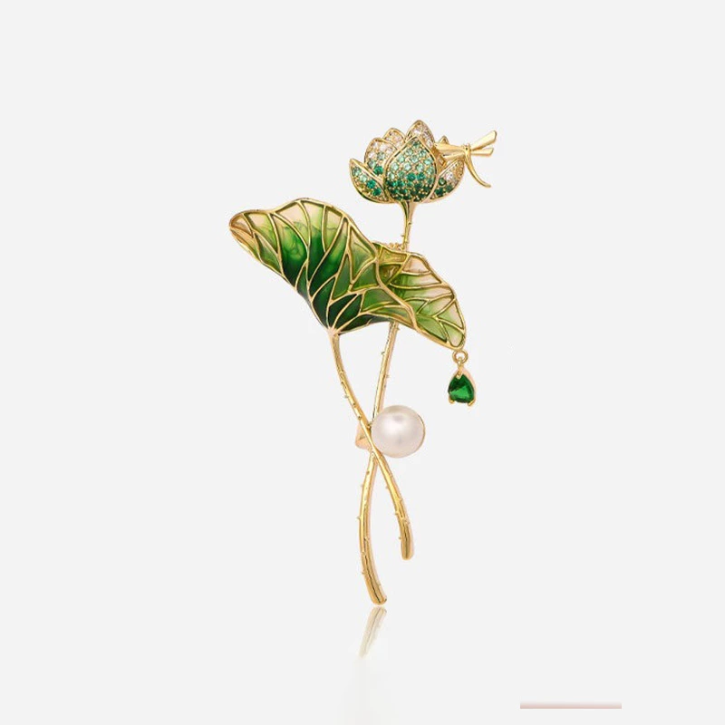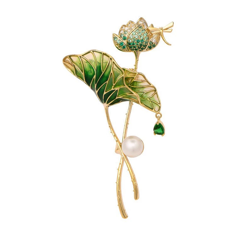 This elegant lotus-themed brooch captures the grace of nature in design. Crafted from durable alloy with a gold-tone finish, it features vibrant green enamel detailing (mimicking lotus leaves) and is accented with dense decorative green stones (cubic zirconia-like elements) on the flower, plus a polished simulated pearl and a small matching stone drop. The delicate stem and petal details add a lifelike touch, making it a refined accessory for daily wear, cultural events, or as a meaningful gift.