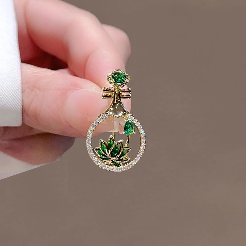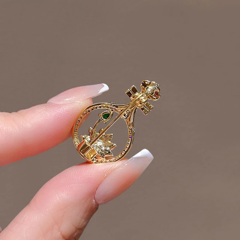 This elegant brooch blends traditional Oriental instruments and floral motifs. Crafted from durable alloy with a gold-tone finish, it features a lute-shaped design: the top is adorned with a green decorative stone (cubic zirconia-like), the circular frame is lined with small clear decorative stones, and the center showcases an enamel lotus (accented with green decorative stones). The refined cultural style makes it a sophisticated accessory for cultural events, formal wear, or as a meaningful gift.