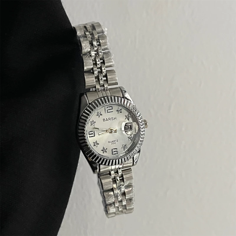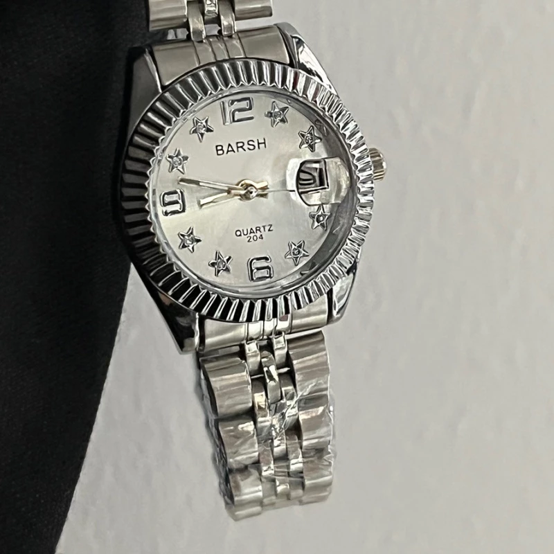 - Dial Features: Mother-of-pearl finish, star-shaped crystal hour markers, Arabic numerals at 12 and 6 o'clock, date window, fluted bezel, round case