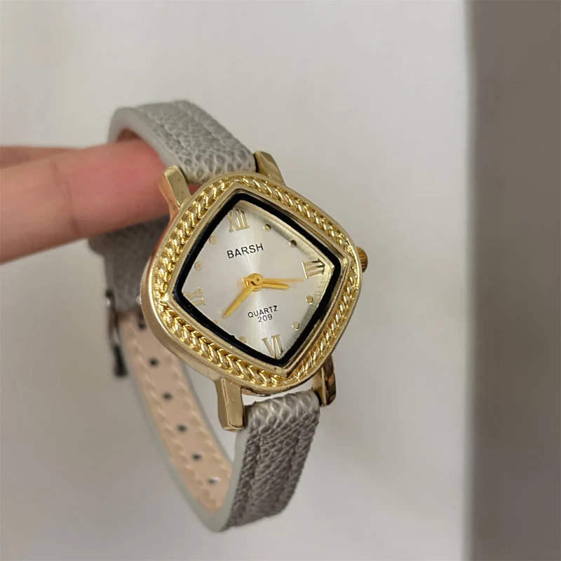 This is a fashion quartz watch designed for daily wear, featuring a polished gold-toned alloy cushion (soft square) case with a textured, braided bezel, paired with a slim black leather strap with a pebbled texture. It has a silver sunray dial with Roman numeral hour markers at 12, 3, 6, and 9 o'clock, a brand logo, and slim, gold-toned hands. The two-tone design and intricate bezel detail create a retro-inspired, versatile aesthetic that makes it a stylish accessory for everyday use or special occasions.
