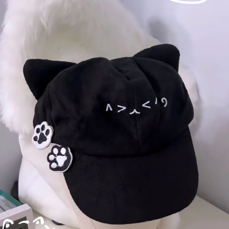 This adorable cat ear cap is a playful and cozy fashion accessory designed for cool weather. It features a soft, everyday fleece fabric construction in classic black, with 3D cat ears, a cute embroidered cat face, and paw-print details for a whimsical, charming look.
