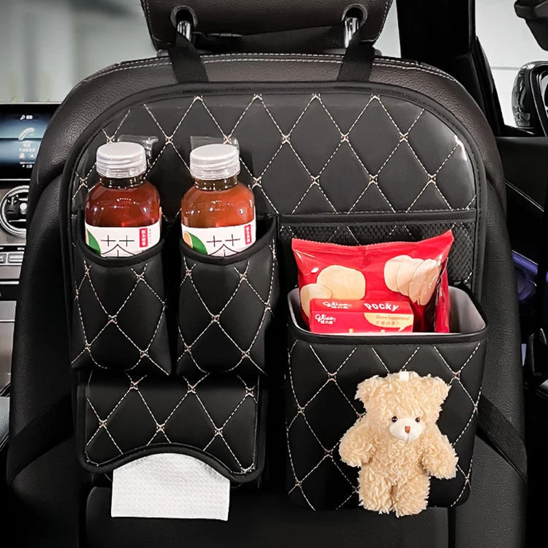 This car seat back organizer is crafted from durable black leatherette fabric with elegant gold-quilted detailing, featuring a multi-functional design: a transparent phone slot (for easy screen operation), 2 cup holders, a tissue compartment, and a large storage pocket (with a detachable plush bear decor for a playful touch). It attaches securely to car seat backs via adjustable straps, keeping daily essentials (phones, drinks, tissues) organized and accessible—ideal for daily commutes or family trips to enhance in-car tidiness.