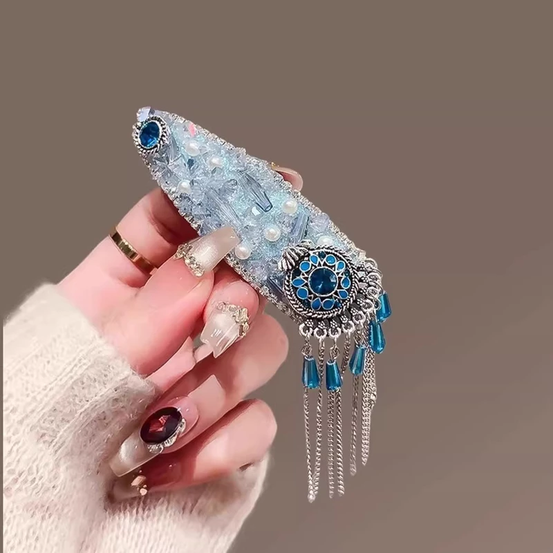 This elegant hair clip features a soft blue color scheme, adorned with artificial clear crystals, faux pearls, and blue decorative gemstones, paired with delicate silver-toned alloy tassels for a bohemian-inspired look.