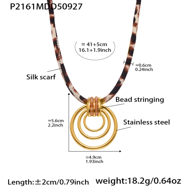 - Material: Gold-tone stainless steel pendant, leopard print silk scarf cord