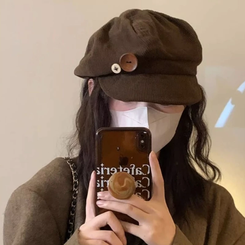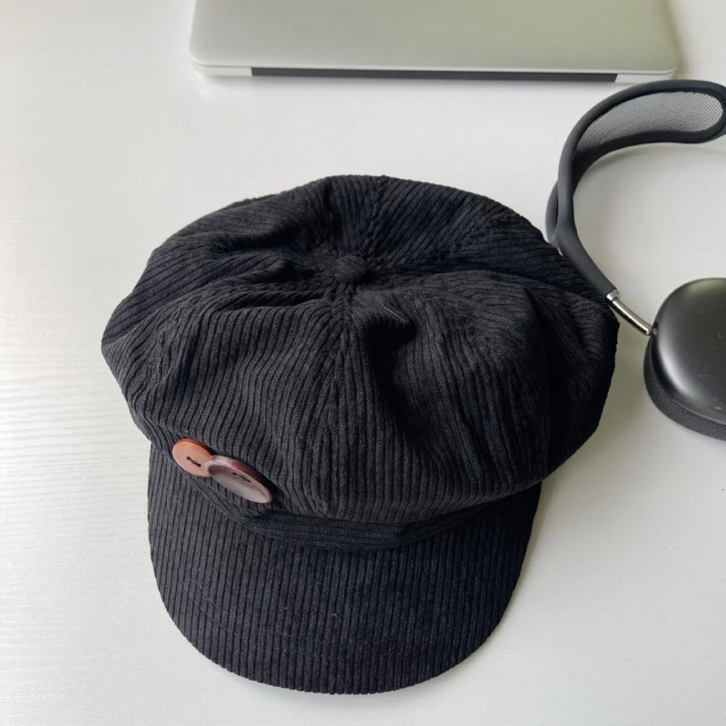 This cozy newsboy cap is a stylish and practical fashion accessory designed for cool weather. It features a soft, ordinary corduroy fabric construction in warm brown, with a vintage-inspired silhouette and a decorative wooden button detail for a retro, understated finish.
