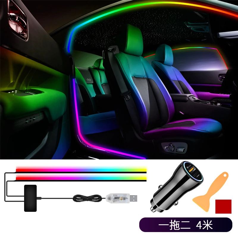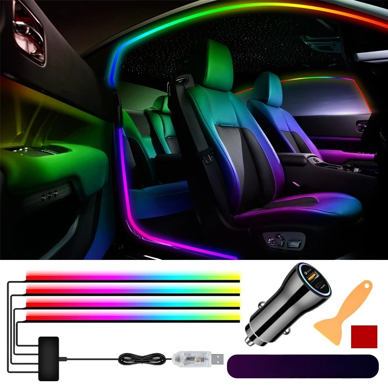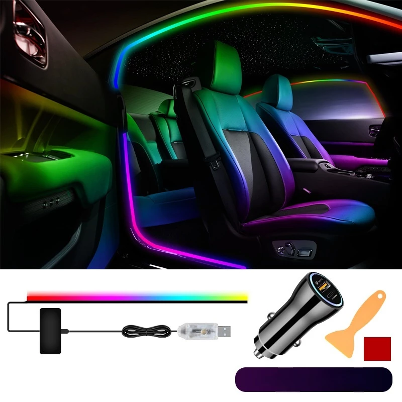 This car RGB LED interior strip light set transforms your vehicle’s cabin into a dynamic, colorful space, combining ambient lighting with practical charging functionality for an enhanced driving experience.