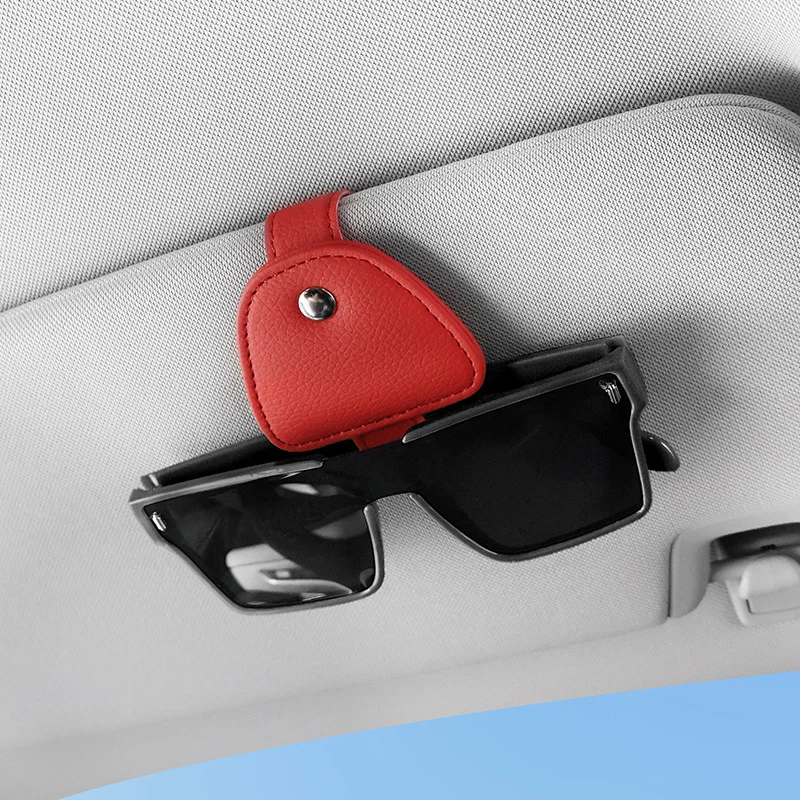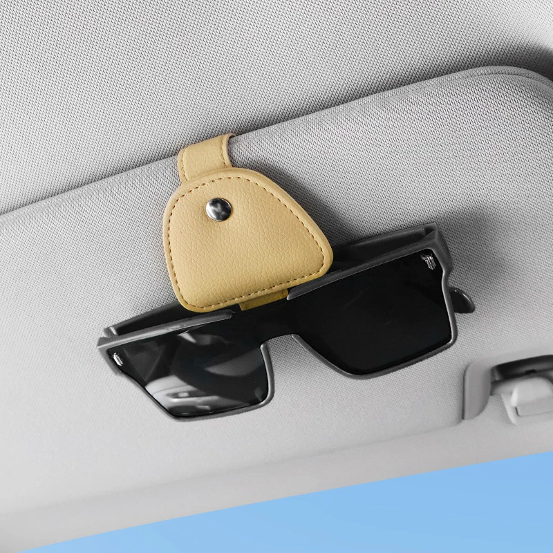 This car sun visor sunglasses clip is crafted from durable, wear-resistant faux leather, designed to keep your sunglasses or eyeglasses secure and within easy reach. It attaches to most standard sun visors via an adjustable elastic strap, and its sturdy clip holds eyewear firmly in place while driving, without scratching lenses or obstructing your view.
