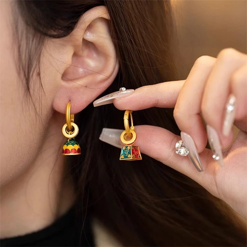 These hoop earrings feature gold-tone alloy hoops paired with artificial enamel pendants (traditional Chinese patterns, not natural materials). The design blends retro cultural elements with modern fashion for a unique aesthetic.
