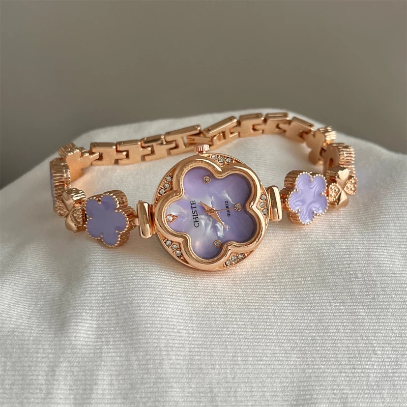 This is a fashion watch designed for daily wear, featuring a rose gold-toned flower-shaped dial with a pink mother-of-pearl pattern, and a matching bracelet strap adorned with pink clover motifs. It functions as both a timekeeping device and a decorative wrist accessory.