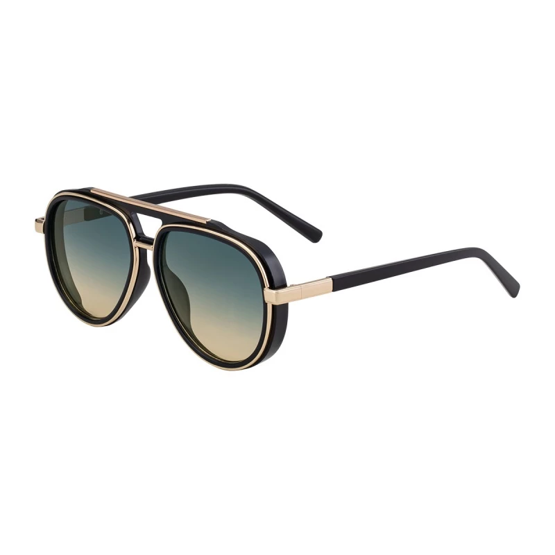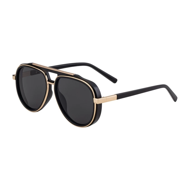 Make a bold retro statement with these contrast double-bridge aviator sunglasses. Crafted from durable PC plastic in a glossy black finish and metal alloy in a polished gold-tone finish, they feature a classic aviator silhouette with a double-bridge design and sleek metal temple accents for a sophisticated, modern vibe. The UV400 protective dark gray lenses block 100% of harmful UVA/UVB rays, ensuring reliable eye protection during all outdoor activities.