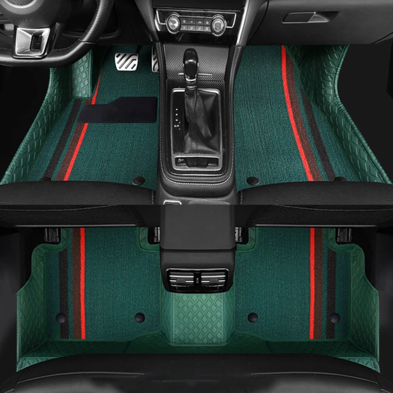 This 7D full coverage car floor mat set offers comprehensive protection for your vehicle’s interior, combining a durable, waterproof base layer with a soft, wear-resistant top layer. Its tailored design covers footwells, side sills, and rear areas to trap dirt, spills, and debris, while the non-slip backing ensures a secure fit. The stylish green finish with red and black accent stripes adds a modern touch to your car’s interior.