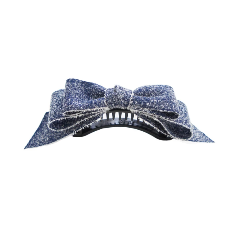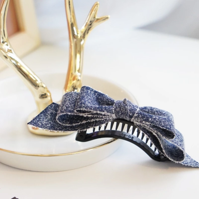This is a women's fashion hair claw clip, designed for daily wear and casual styling. It features a multi-layered bow made of a textured, denim-like fabric, with an alloy claw base for a secure hold. The clip is intended as a decorative hair accessory to hold hair in place and add a stylish, casual touch to an outfit.