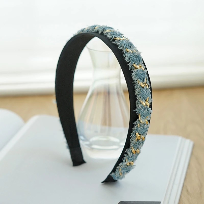 This is a women's fashion headband, designed for daily wear and casual styling. It features a black fabric base with a textured, denim-like fringe accent interwoven with an alloy chain detail. The headband is intended as a decorative hair accessory to hold hair in place and add a stylish, edgy touch to an outfit.