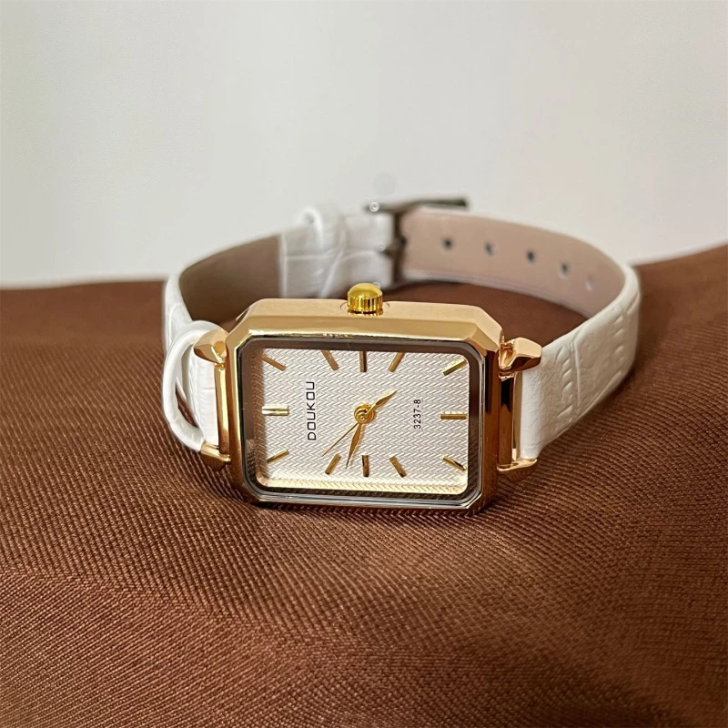 - Dial Features: Light beige textured finish, linear hour markers, rectangular case