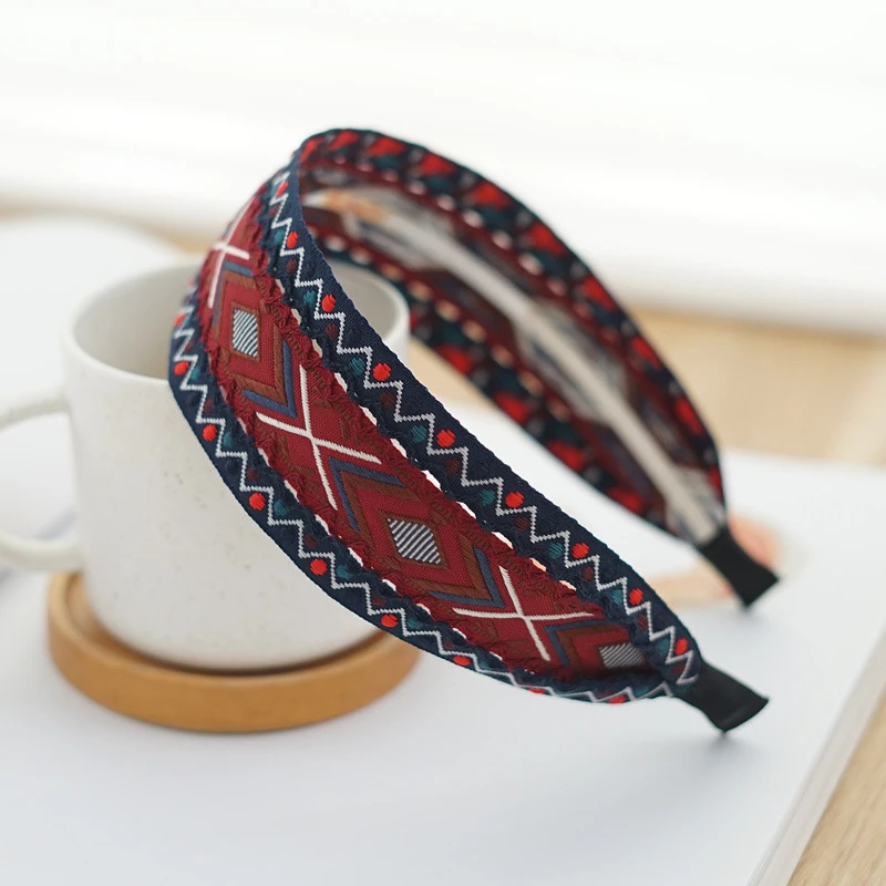 This is a fashion hair accessory. It features a slim, padded plastic headband base covered with a woven fabric ribbon that is printed with a vibrant ethnic-inspired geometric pattern. The inner side of the headband has a non-slip lining to help keep it in place, providing a comfortable and secure fit for everyday wear.
