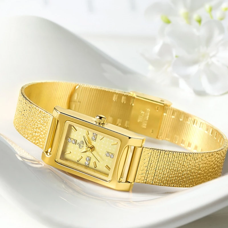 - Dial Features: Rectangular shape, mother-of-pearl finish with crosshatch texture, decorative crystal hour markers, three-hand display (hour/minute/second)