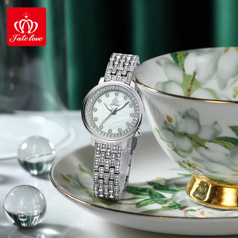 This is a fashion quartz watch designed for daily wear. It features a delicate, round silver-toned alloy case encrusted with a double row of sparkling stones along the bezel, paired with an intricately designed, crystal-embellished link alloy strap that offers a luxurious, bracelet-like appearance. The striking green dial has a fine, horizontal striped texture, accented by minimalist stone hour markers and the Fatelove crown logo, creating an elegant and eye-catching aesthetic ideal for special occasions and everyday glamour.