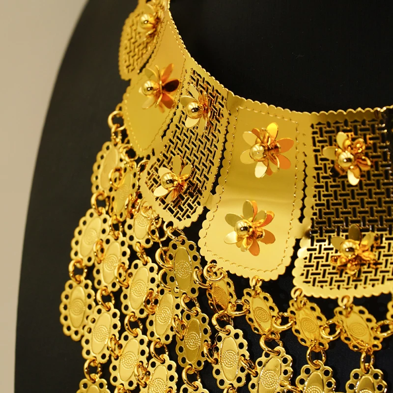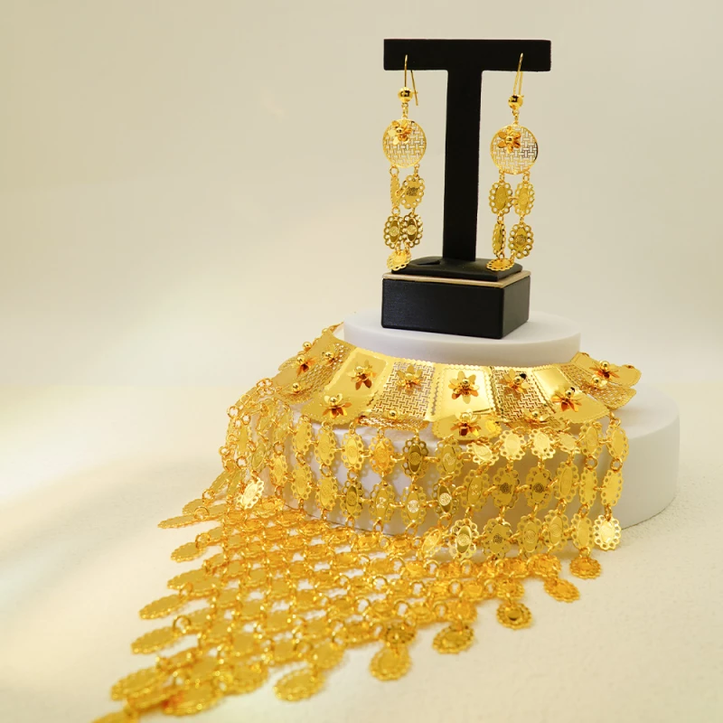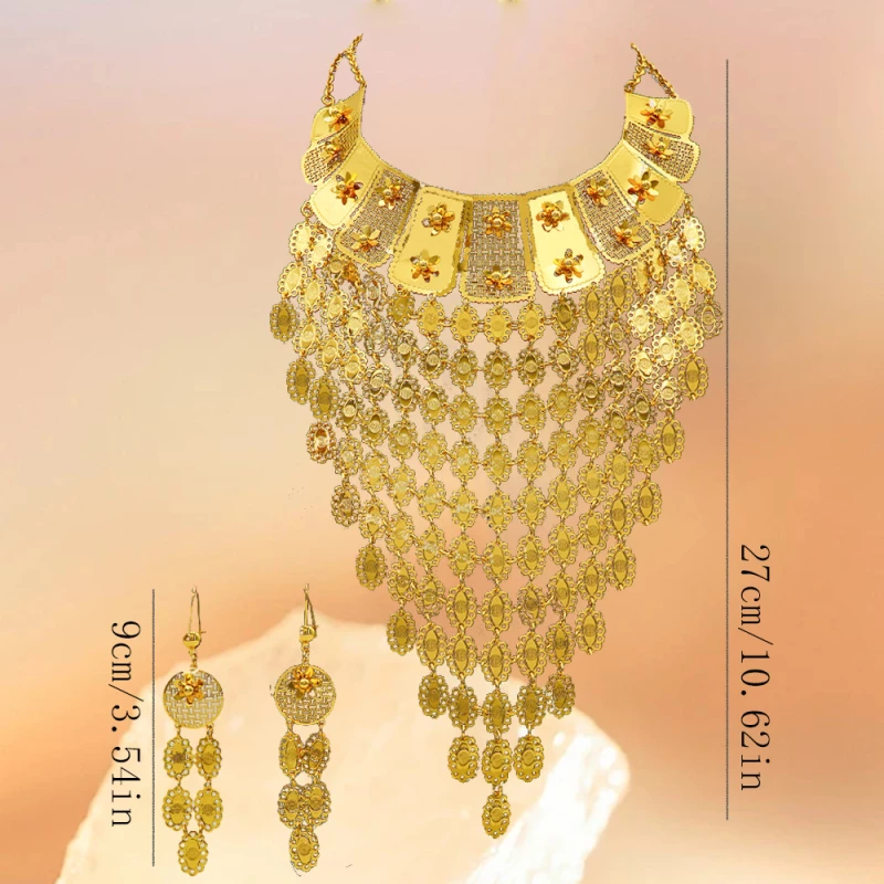 This dramatic 2-piece jewelry set (collar necklace + earrings) is crafted from alloy with a polished gold-toned finish, featuring intricate filigree cutout detailing and a cascading mesh design (no natural gemstones or precious metals are used). The wide collar necklace showcases a structured top border with embossed accents, paired with a layered, mesh-style cascade for maximum visual impact, while the matching earrings echo the filigree pattern for a cohesive, luxurious aesthetic.