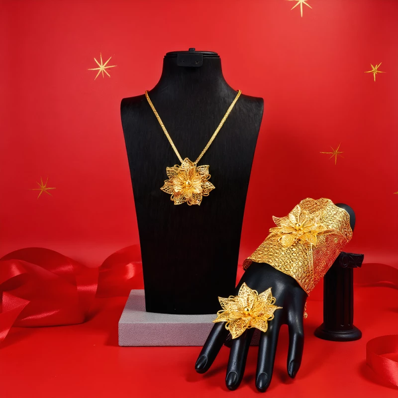 Lightweight and designed for comfortable wear, the necklace features a secure clasp, the cuff bracelet has a flexible open design for easy adjustment, and the ring has a smooth band for a secure fit. This set is ideal for formal events, festive gatherings, or adding a touch of refined glamour to modern or traditional attire.