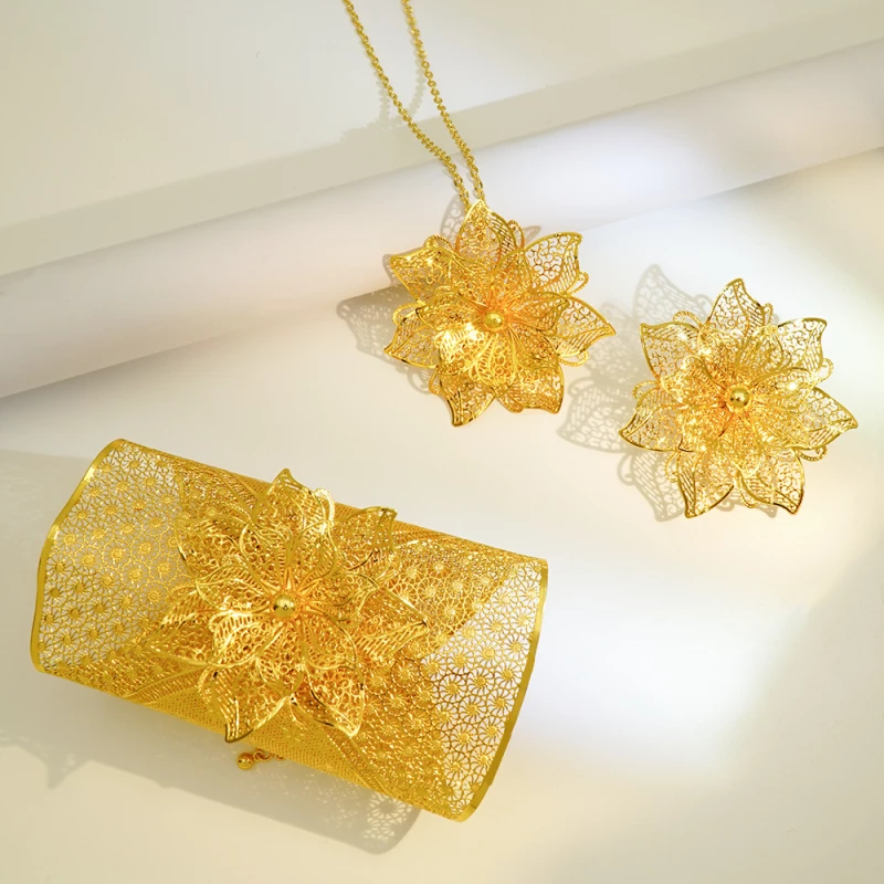 This elegant 3-piece jewelry set (necklace + cuff bracelet + ring) is crafted from alloy with a polished gold-toned finish, featuring intricate filigree floral detailing and openwork patterns (no natural gemstones or precious metals are used). The delicate, lace-like floral motif is consistent across all pieces, creating a cohesive, romantic aesthetic.