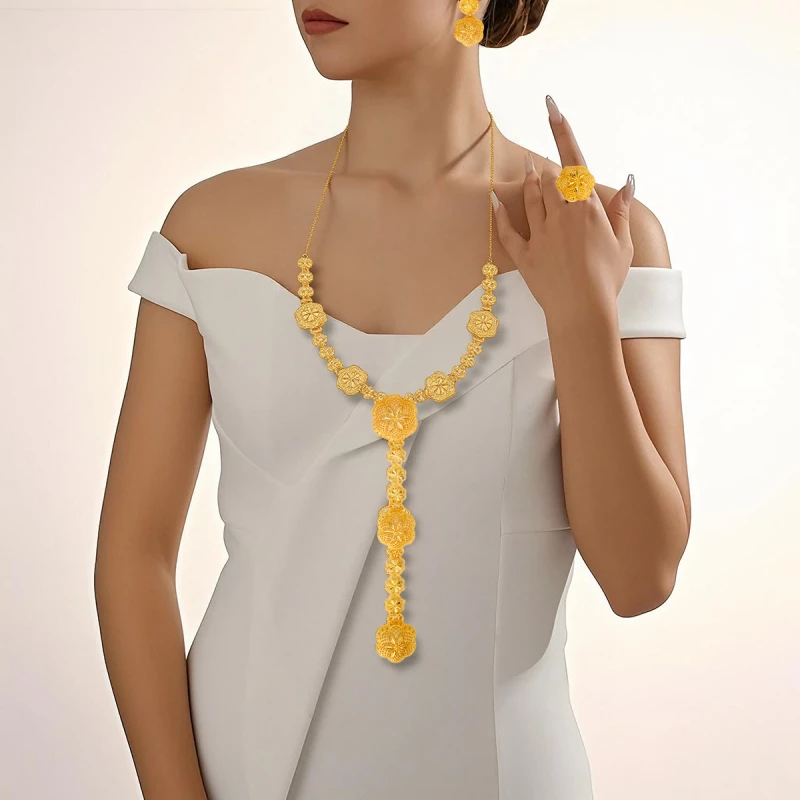 This elaborate 3-piece jewelry set (full-body necklace + earrings + ring) is crafted from alloy with a polished gold-toned finish, featuring intricate filigree floral cutout detailing (no natural gemstones or precious metals are used). The long, full-body necklace showcases a series of graduated floral motifs and openwork links, while the matching earrings and ring echo the filigree design for a cohesive, luxurious aesthetic.