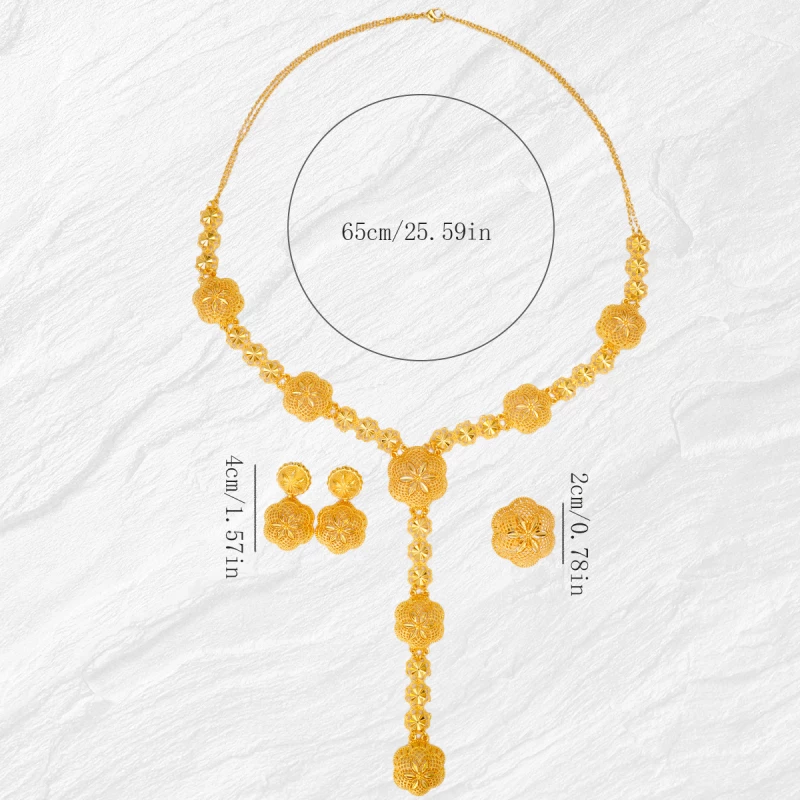 Lightweight and designed for comfortable wear, the necklace includes a secure clasp, the earrings use stable post backs, and the ring has a smooth band for a secure fit. This set is ideal for formal events, festive gatherings, or traditional attire, adding a striking, eye-catching touch of elegance to any outfit.