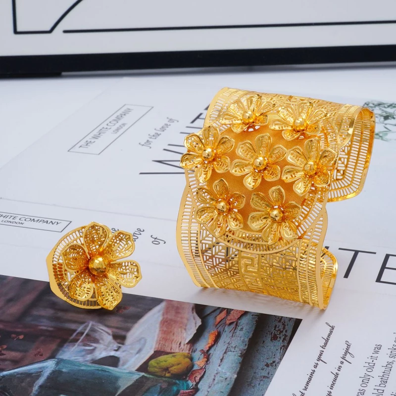 This striking 2-piece jewelry set (cuff bracelet + ring) is crafted from alloy with a polished gold-toned finish, featuring intricate floral detailing and geometric lace cutout patterns (no natural gemstones or precious metals are used). The wide cuff bracelet showcases a layered floral centerpiece framed by a textured geometric border, while the matching ring echoes the floral design for a cohesive, sophisticated look.