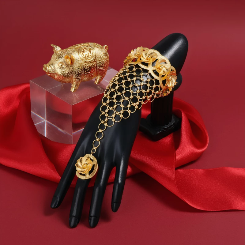 This dramatic 2-piece hand jewelry set (cuff bracelet + ring connected by a mesh chain) is crafted from alloy with a polished gold-toned finish, featuring intricate floral filigree detailing and a voluminous mesh cascade (no natural gemstones or precious metals are used). The wide cuff bracelet showcases layered floral motifs, while the matching ring is linked by an openwork mesh chain for a cohesive, eye-catching aesthetic.
