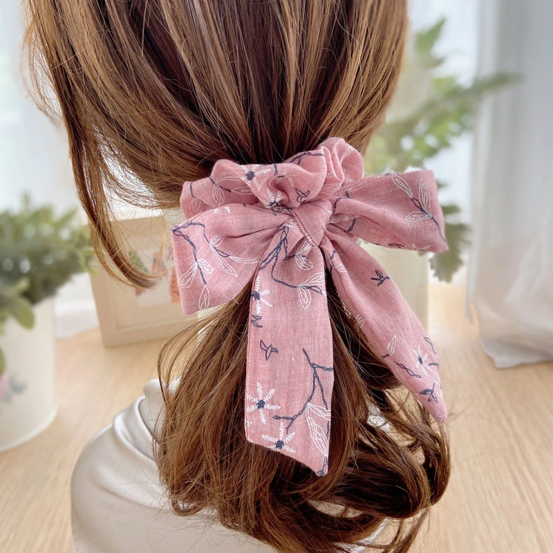 This is a fashion hair accessory. It features a large, lightweight linen bow clip printed with a delicate black floral pattern. The strong, spring-loaded clip provides a secure hold for half-up or updo hairstyles, adding a fresh, natural and elegant touch to any look.
