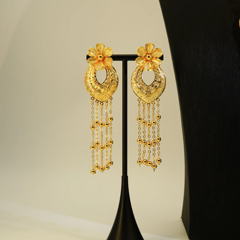 This sophisticated 2-piece jewelry set (necklace + earrings) is crafted from alloy with a polished gold-toned finish, featuring intricate floral detailing and layered beaded tassel accents (no natural gemstones or precious metals are used). The statement necklace showcases a textured floral centerpiece paired with cascading tassel chains, while the matching earrings echo the design for a cohesive, elegant aesthetic.