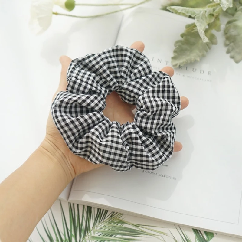 This is a set of fashion hair accessories. Each scrunchie is made from a soft, breathable cotton fabric printed with a classic gingham check pattern. The elastic core provides a gentle yet secure hold for ponytails, buns, or half-up hairstyles, suitable for everyday casual wear.