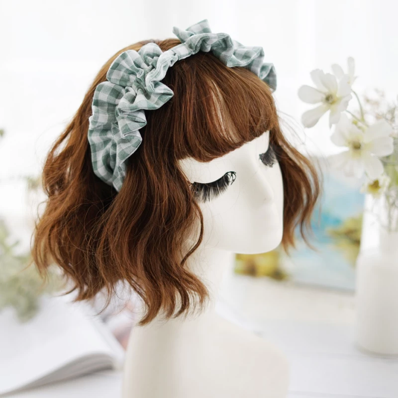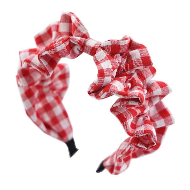 This is a women's fashion headband, designed for daily wear and casual styling. It features a ruffled fabric overlay with a classic red and white gingham check pattern, mounted on a slim, black fabric base. The headband is intended as a decorative hair accessory to hold hair in place and add a fresh, preppy touch to an outfit.