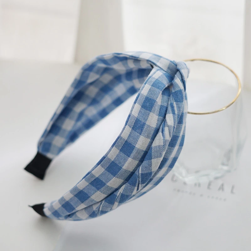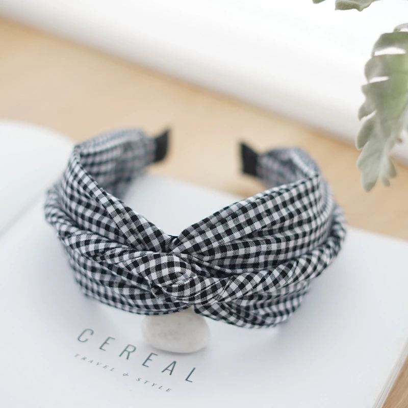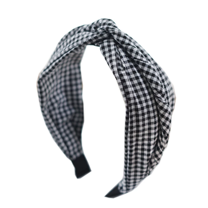 This is a fashion hair accessory. It features a stretchable fabric headband with a classic black-and-white gingham pattern, finished with a knotted detail at the top. The soft, breathable material provides a comfortable and secure fit for everyday casual wear, adding a fresh, retro-inspired touch to any hairstyle.
