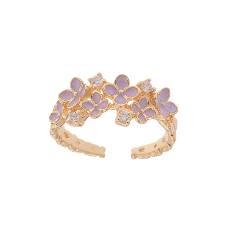 This delicate 2-piece layered ring set features gold-tone alloy bands: one adorned with purple enamel butterfly details, the other with purple enamel floral motifs—both accented with sparkling cubic zirconia. The lightweight alloy construction ensures comfortable daily wear, while the soft, feminine design adds a whimsical touch to casual outfits, brunch looks, or soft formal ensembles. As versatile fashion accessories, these rings blend vivid enamel color with polished detailing—ideal for gifting or elevating your romantic style.