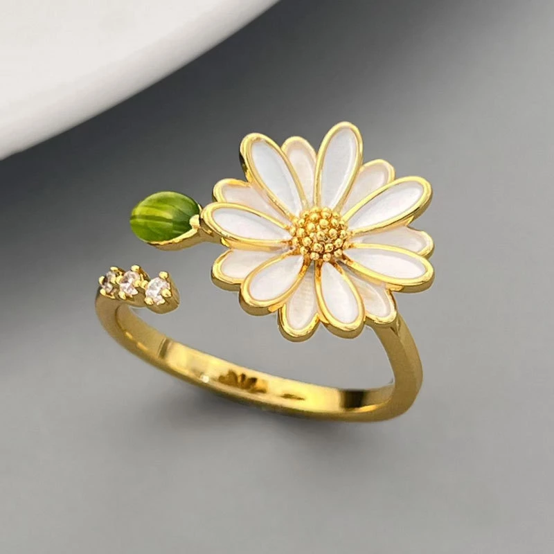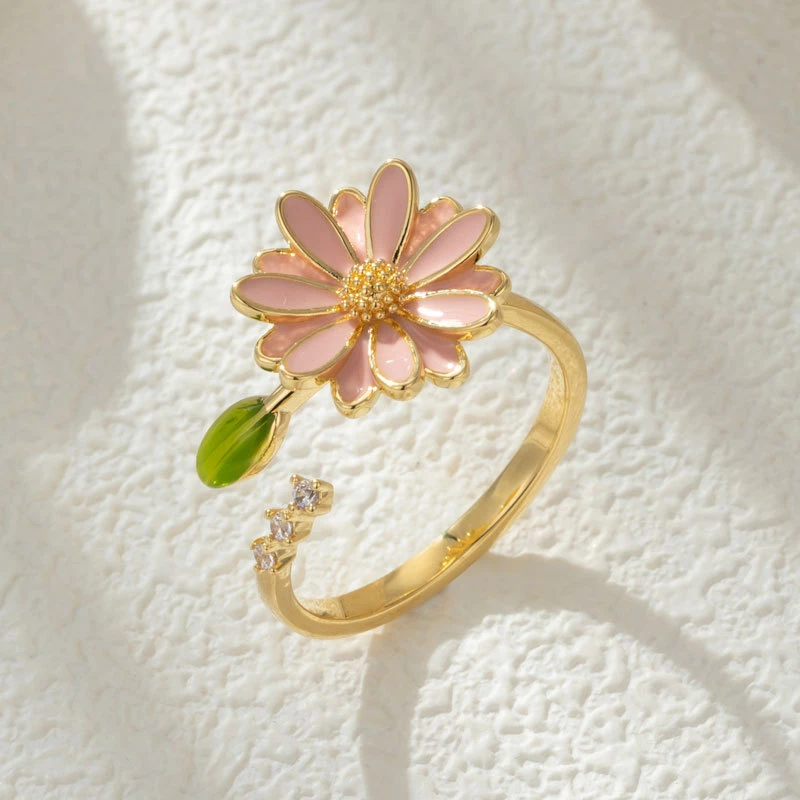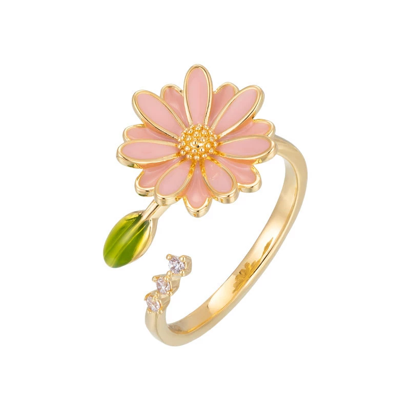 This whimsical open ring features a gold-tone alloy band adorned with a detailed daisy design: soft pink enamel petals, a textured gold-tone center, a green enamel leaf, and tiny cubic zirconia (decorative gem) accents. The lightweight alloy construction ensures comfortable daily wear, while the vibrant, nature-inspired details add a playful, feminine touch to casual outfits, picnic looks, or soft summer ensembles. As a versatile fashion accessory, it blends vivid color with polished detailing—ideal for gifting or brightening your everyday style.