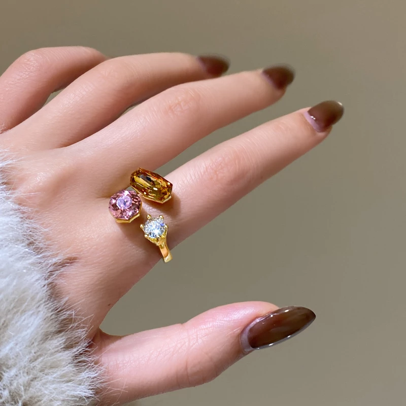 This bold layered ring set features a gold-tone alloy band adorned with three faceted artificial gems: a vibrant yellow rectangular stone, a bright pink hexagonal stone, and a sparkling white cubic zirconia. The lightweight alloy construction ensures comfortable daily wear, while the colorful, statement-making design adds a glamorous touch to evening outfits, festive looks, or bold casual ensembles. As a versatile fashion accessory, it blends vivid color contrast with polished detailing—ideal for gifting or elevating your eye-catching style.