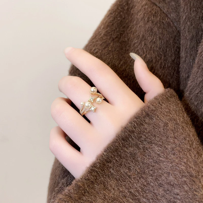 This delicate layered ring features a gold-tone alloy band, adorned with multiple round faux pearls and sparkling cubic zirconia accents. The lightweight alloy construction ensures comfortable daily wear, while the soft pearl and shimmering gem details add a romantic, elegant touch to knitwear outfits, brunch looks, or soft formal ensembles. As a versatile fashion accessory, it blends classic pearl charm with polished detailing—ideal for gifting or elevating your feminine style.