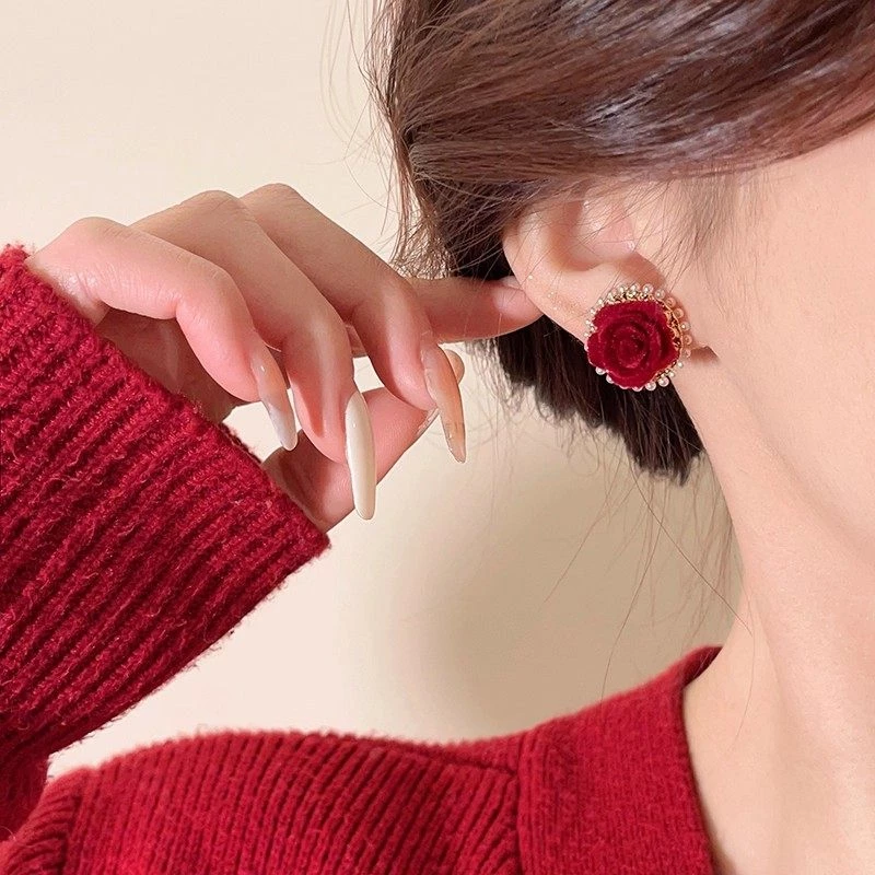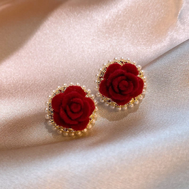 These luxurious stud earrings feature a plush red velvet rose motif, framed in polished gold-tone alloy and trimmed with tiny faux pearls and cubic zirconia for subtle sparkle. The soft velvet texture balances rich, romantic style with comfortable wear, while the secure stud backing ensures stability for all-day use. Ideal for elevating casual sweaters or adding a sophisticated touch to formal looks, this pair is a timeless addition to any fashion jewelry collection—perfect for gifting or personal styling.