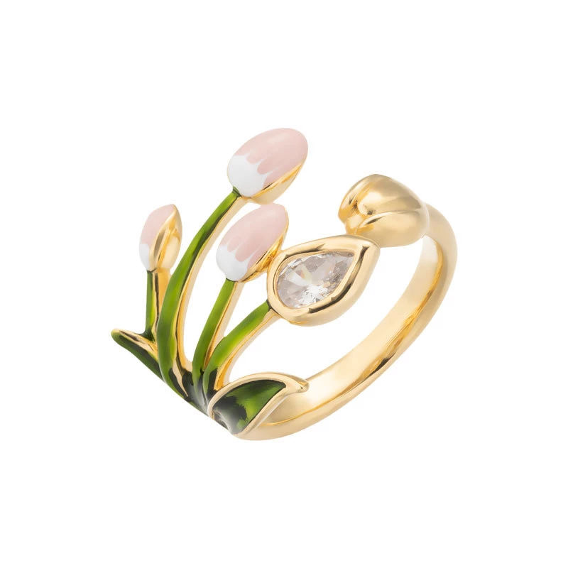 This delicate open ring features a gold-tone alloy base designed into a cluster of tulip buds: soft white enamel petals, vivid green enamel stems, and a tiny cubic zirconia (decorative gem) accent. The lightweight alloy construction ensures comfortable daily wear, while the charming floral details add a romantic, spring-inspired touch to casual outfits, office looks, or soft weekend ensembles. As a versatile fashion accessory, it blends gentle color with polished detailing—ideal for gifting or adding a whimsical touch to your style.