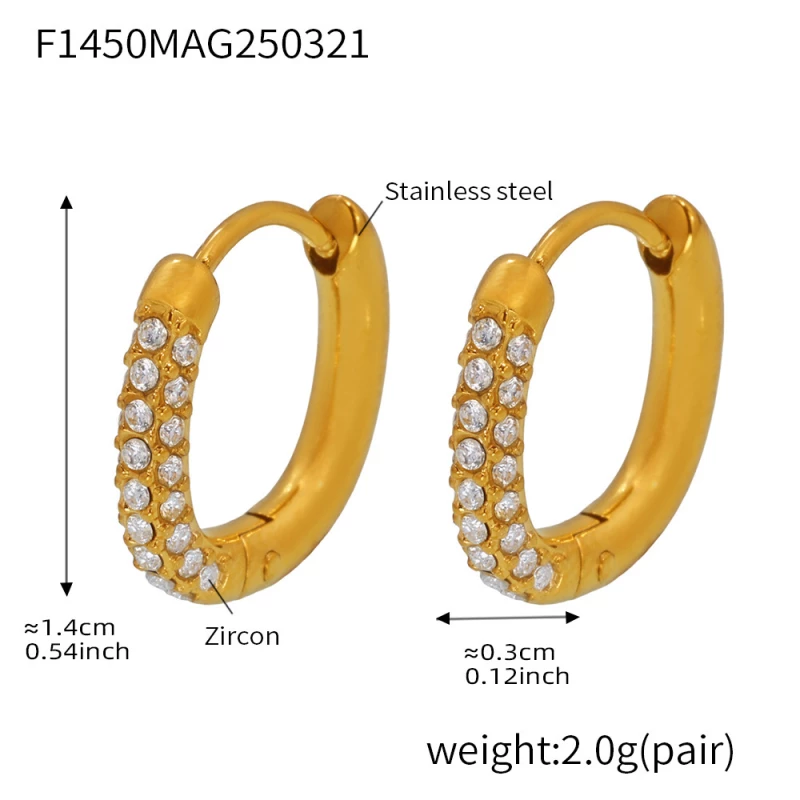 These elegant, eye-catching huggie hoop earrings are crafted from durable stainless steel with a polished gold-tone finish. They feature a half-hoop design paved with sparkling zircon stones, creating a subtle yet glamorous look that elevates any outfit.