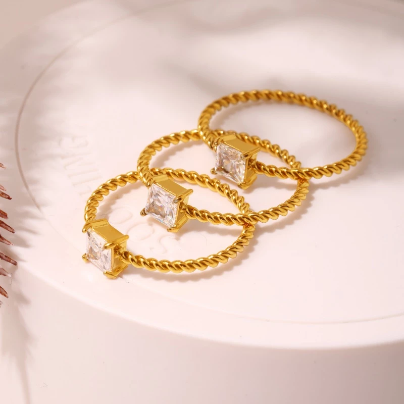 A delicate yet eye-catching solitaire ring crafted from durable gold-plated alloy, featuring a twisted rope-style band and a sparkling princess-cut cubic zirconia centerpiece for a timeless, romantic look.