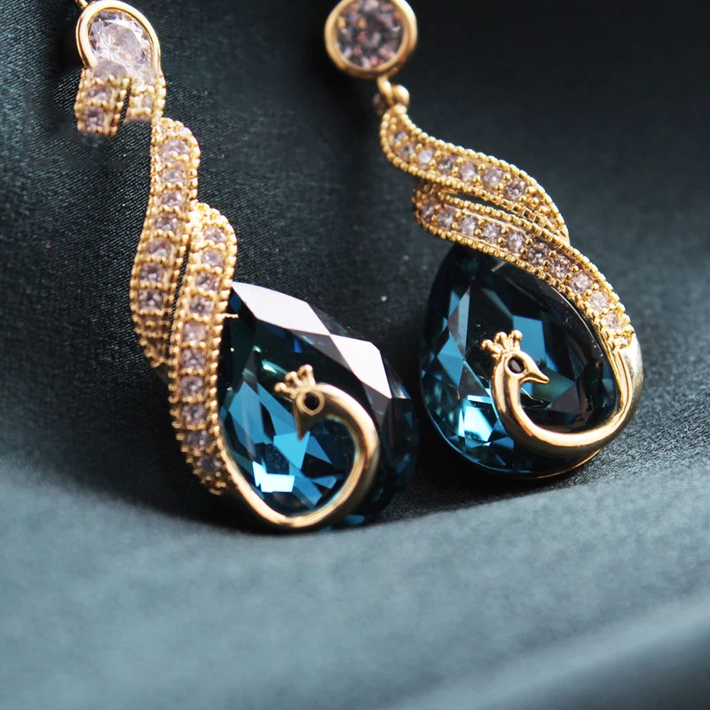 Lightweight despite the detailed design, the drop structure adds elegant movement while the hook back ensures a secure fit. Its blend of golden-tone sophistication and peacock-themed sparkle makes it a versatile accessory that balances glamour and wearability.