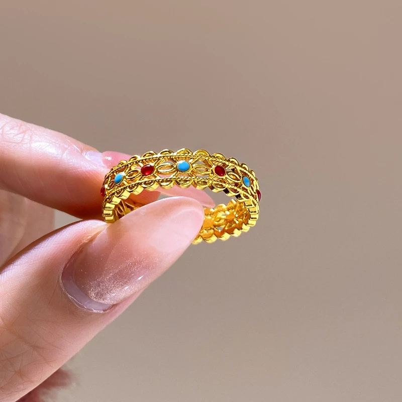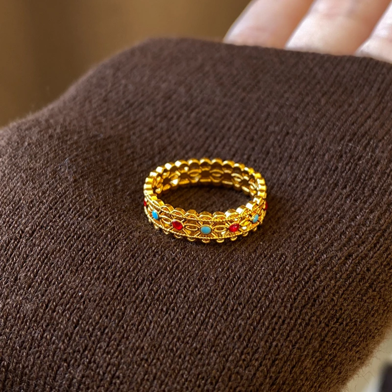 This intricate band ring is crafted from durable golden-tone alloy, featuring delicate filigree detailing adorned with small turquoise and red artificial stones. The polished metallic base and vibrant color accents create a rich, culturally inspired look that complements casual or traditional-style attire.