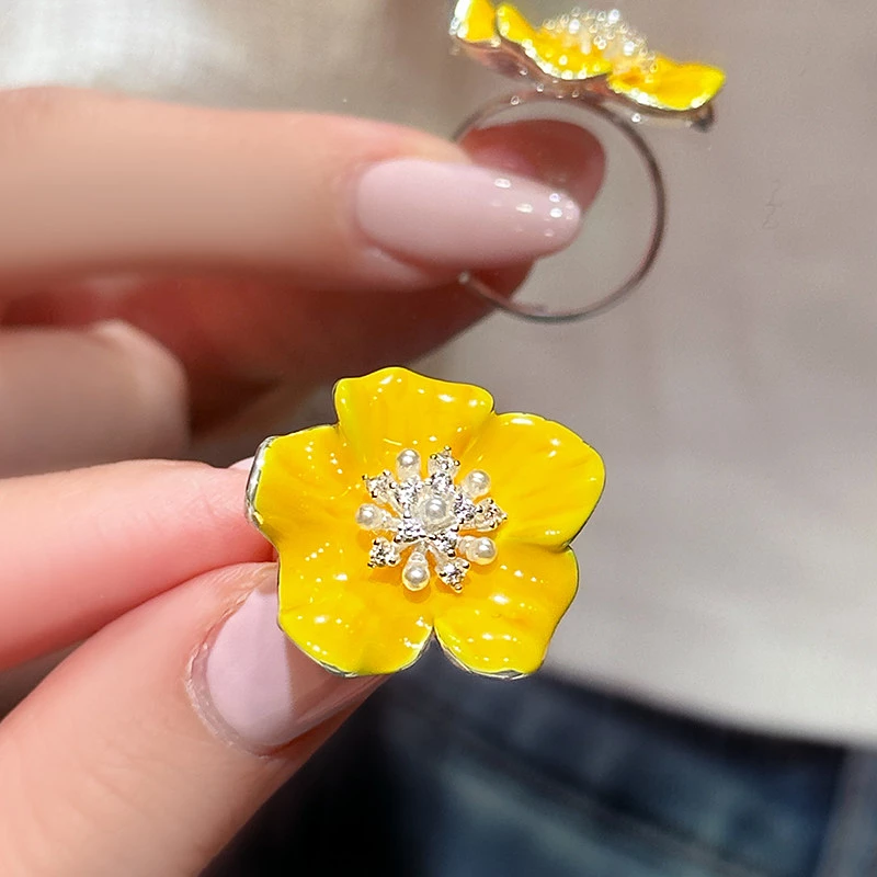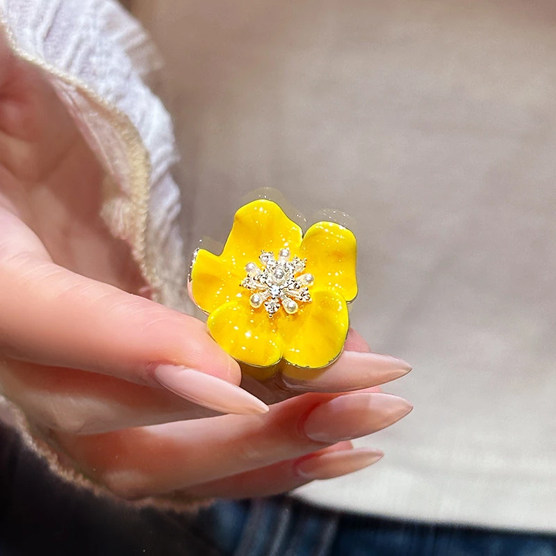 This lively floral ring is crafted from durable golden-tone alloy, featuring a bright yellow enamel petal design paired with a central cluster of shimmering cubic zirconia. The polished metallic base and vivid enamel details create a cheerful, eye-catching look that complements casual or summer-themed attire.