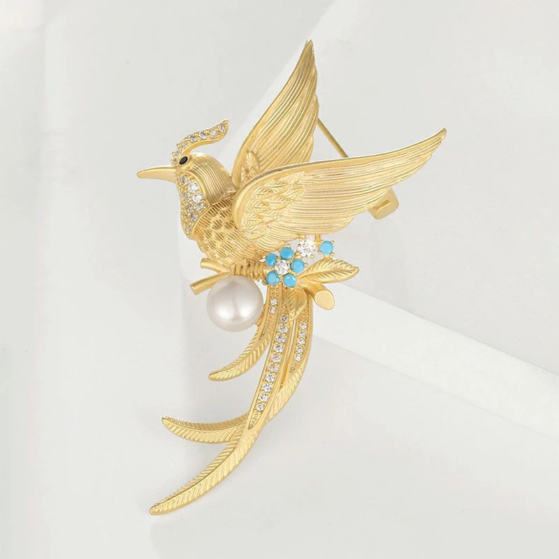 This intricately crafted brooch showcases a lifelike hummingbird design, made from durable golden-tone alloy with detailed texturing for a polished, vivid appearance. It features shimmering cubic zirconia accents (on the head and tail), a smooth faux pearl, and small artificial turquoise details—blending nature-inspired charm with decorative shimmer to enhance any outfit.