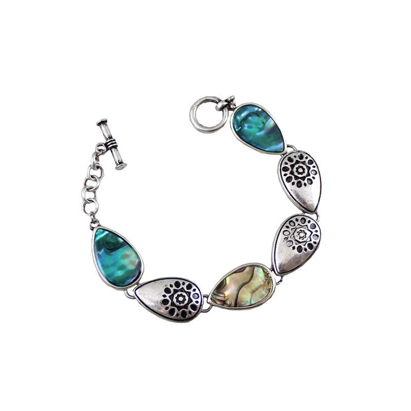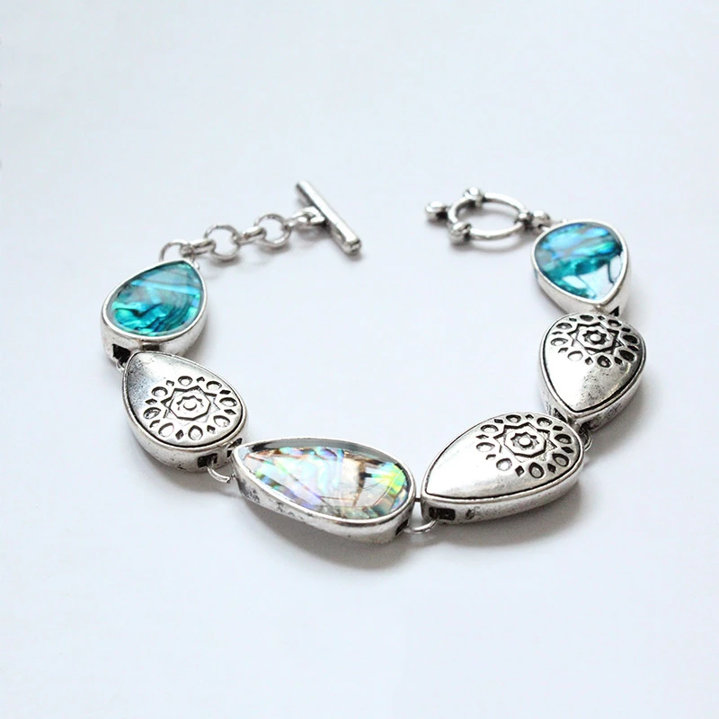 This bracelet is crafted from durable golden-tone alloy, featuring a link design of three teardrop elements: a red artificial gem, a patterned metal piece, and an iridescent artificial shell-like gem, paired with an adjustable chain clasp. The warm golden finish complements the varied textures (glossy gem, detailed metal, shimmering shell) to create a boho-chic, eclectic look ideal for daily wear, casual outings, or layered styling.