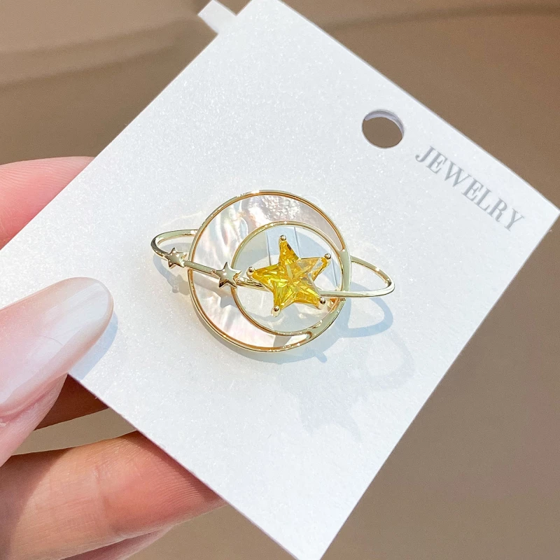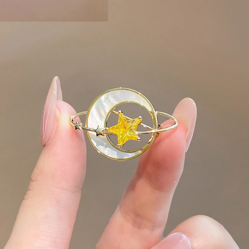 This ring is crafted from durable golden-tone alloy, featuring a 3D celestial design: a pearlescent artificial moon base paired with a prominent yellow cubic zirconia star (accented by a tiny zirconia detail) and a sleek orbital band. The warm golden finish complements the soft pearlescent texture and vibrant yellow sparkle, creating a dreamy, elegant look ideal for daily wear, casual outings, or celestial-themed styling.