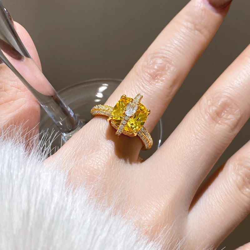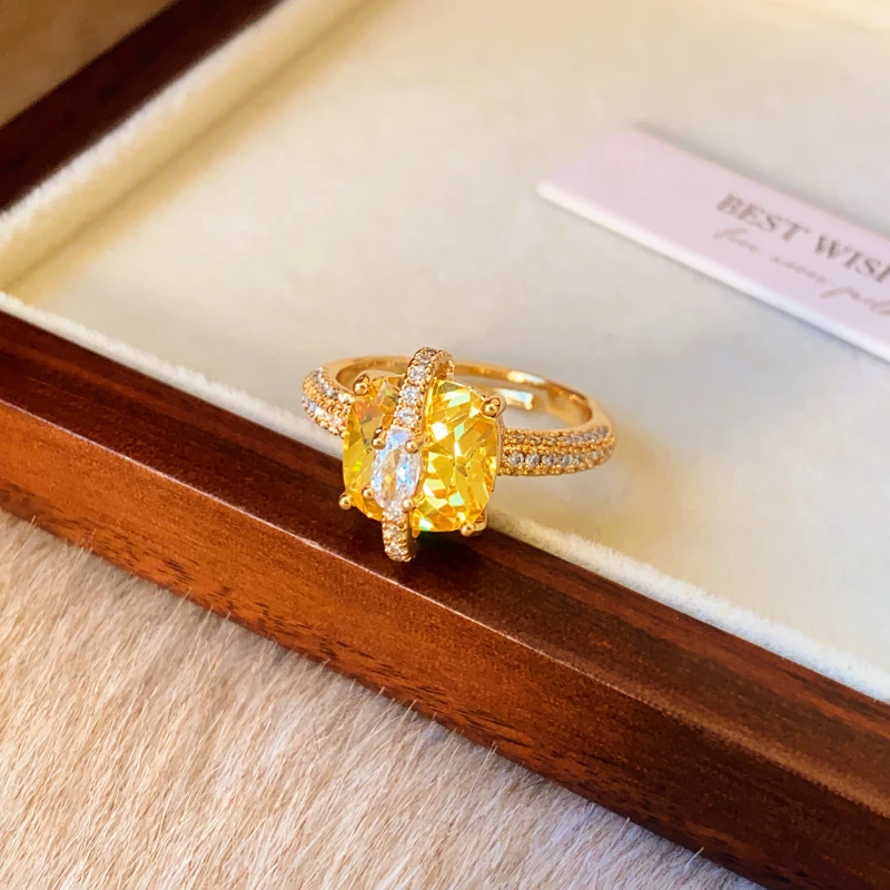This eye-catching statement ring is crafted from durable golden-tone alloy, finished with a polished, luxurious-looking design. It centers on a bold yellow artificial crystal (in a geometric cut), framed by shimmering cubic zirconia accents (on the band and setting)—creating a luminous, glamorous piece that elevates formal or special-occasion attire.